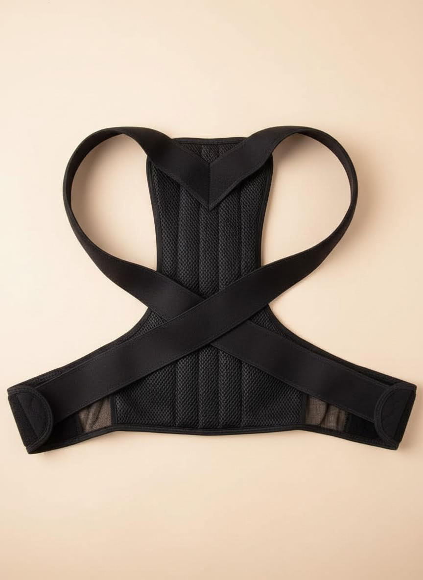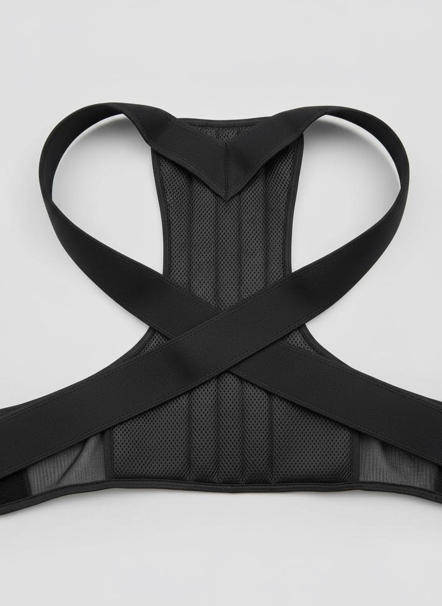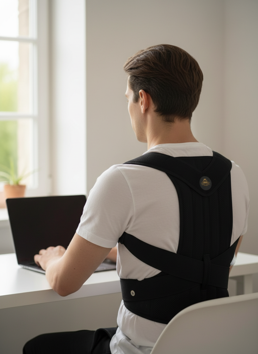 De houding corrector trekt je schouders zacht naar achteren en herinnert je lichaam aan de juiste positie. Niet met kracht of pijn — maar door je spieren te activeren die jarenlang passief zijn geweest.